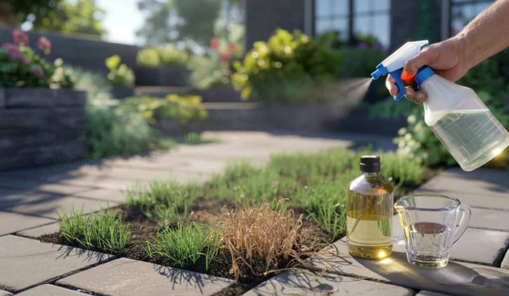 Schoonmaakazijn bevat azijnzuur, een natuurlijk middel dat de groei van onkruid kan remmen. Het is populair vanwege de eenvoud en lage kosten.